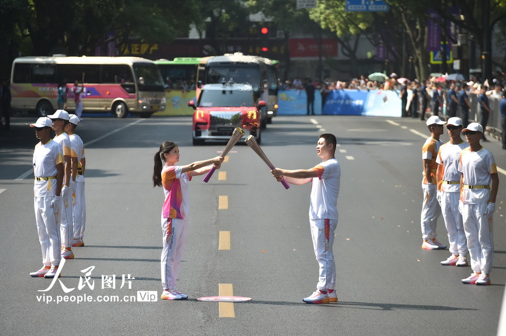 2023年9月11日,杭州亚运会火炬传递到古城绍兴后,受到沿途观众热烈欢迎。潘海松摄(人民图片网)