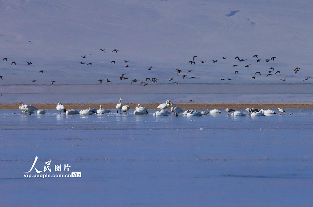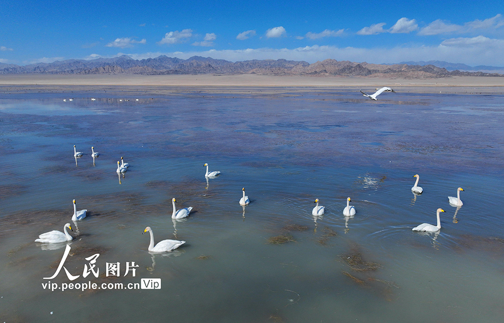 近日,大批天鹅等候鸟在甘肃省酒泉市阿克塞县苏干湖湿地翔集,准备前往南方过冬,为深秋的苏干湖湿地增添了一道靓丽风景。马晓伟摄(人民图片网)
