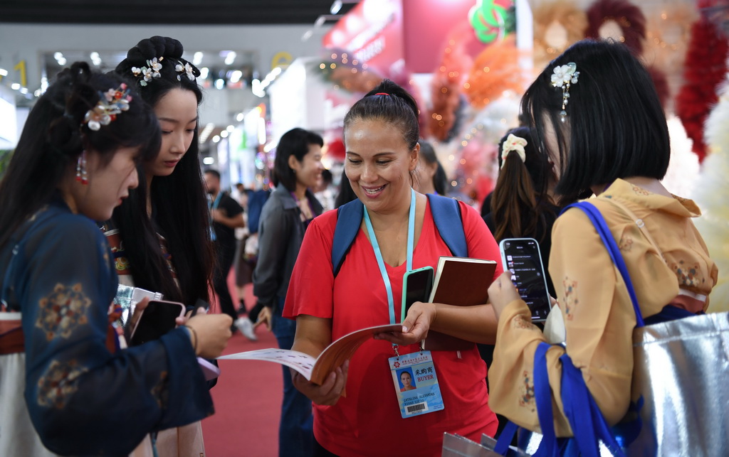 10月23日,外国采购商在仿真花展台参观。新华社记者 邓华 摄