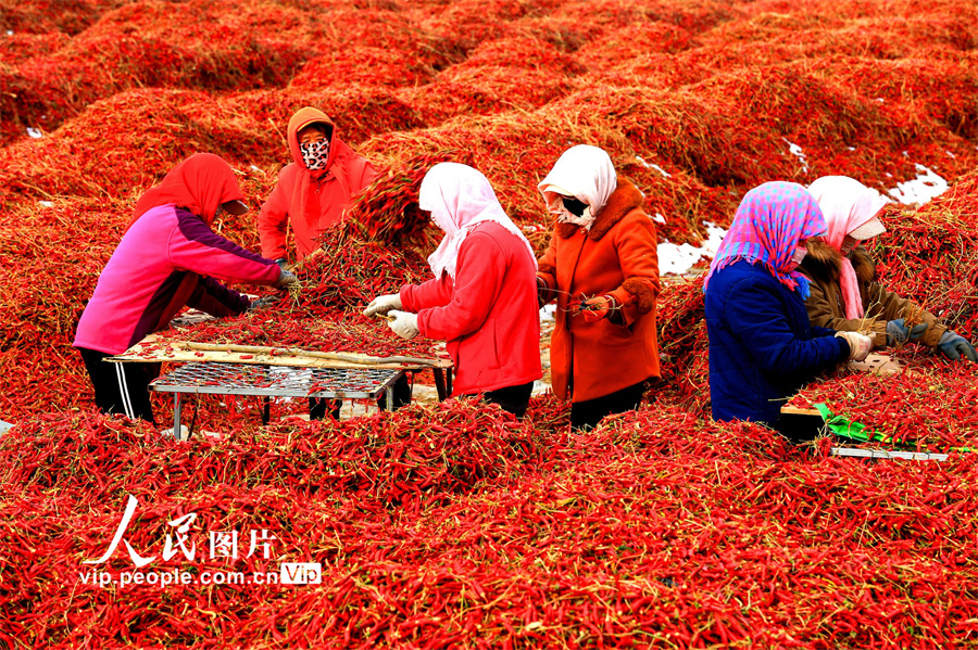 2023年11月8日,雪后的甘肃省张掖市甘州区上秦镇高升庵村辣椒晾晒场上,村民正在进行辣椒过筛、精选作业,火红的辣椒晾晒场上一片忙碌景象。杨永伟摄(人民图片网)