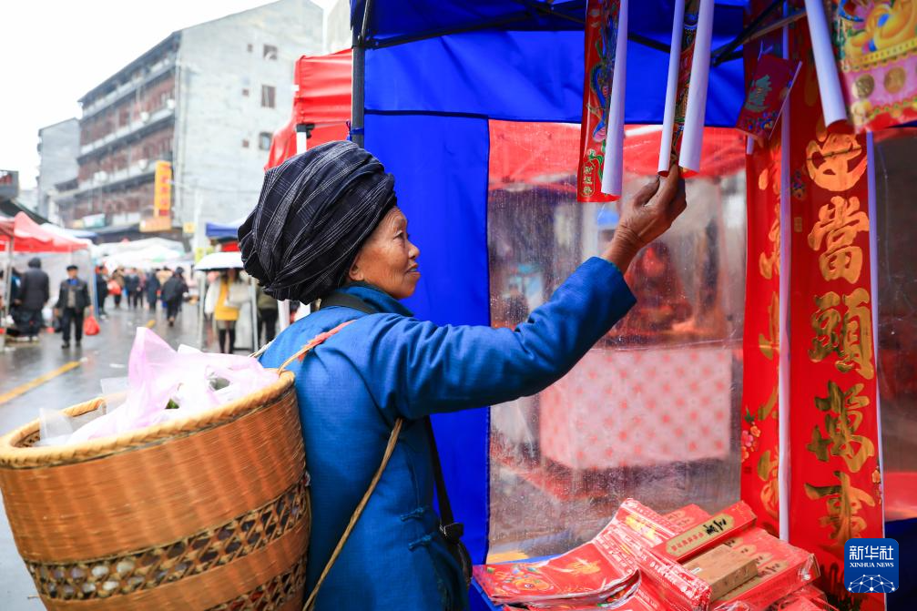 1月18日,顾客在湖南省凤凰县山江镇集市上选购春联。