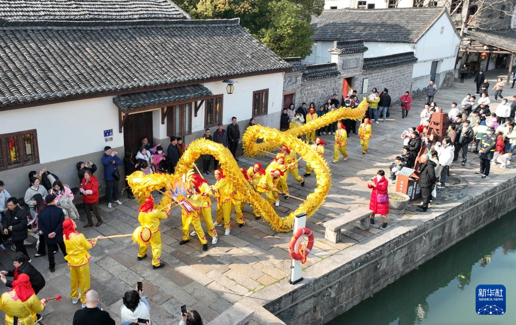 2月10日,民间艺人在浙江省湖州市德清县新市古镇表演舞龙(无人机照片)。