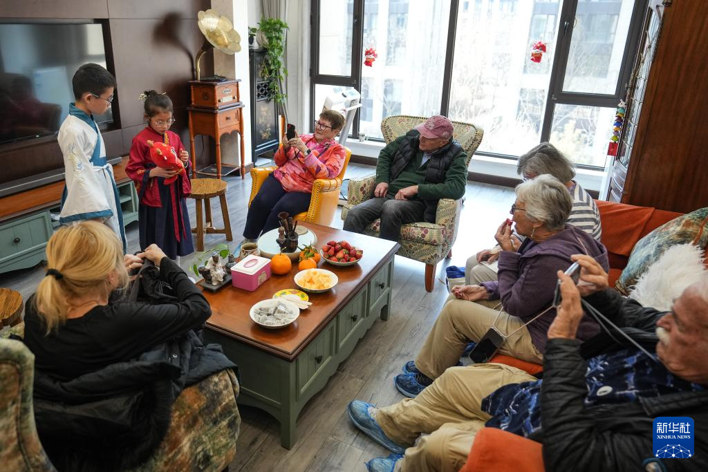 3月10日,在大连市中山区东港商务区一户市民家中,小朋友与游客交流。