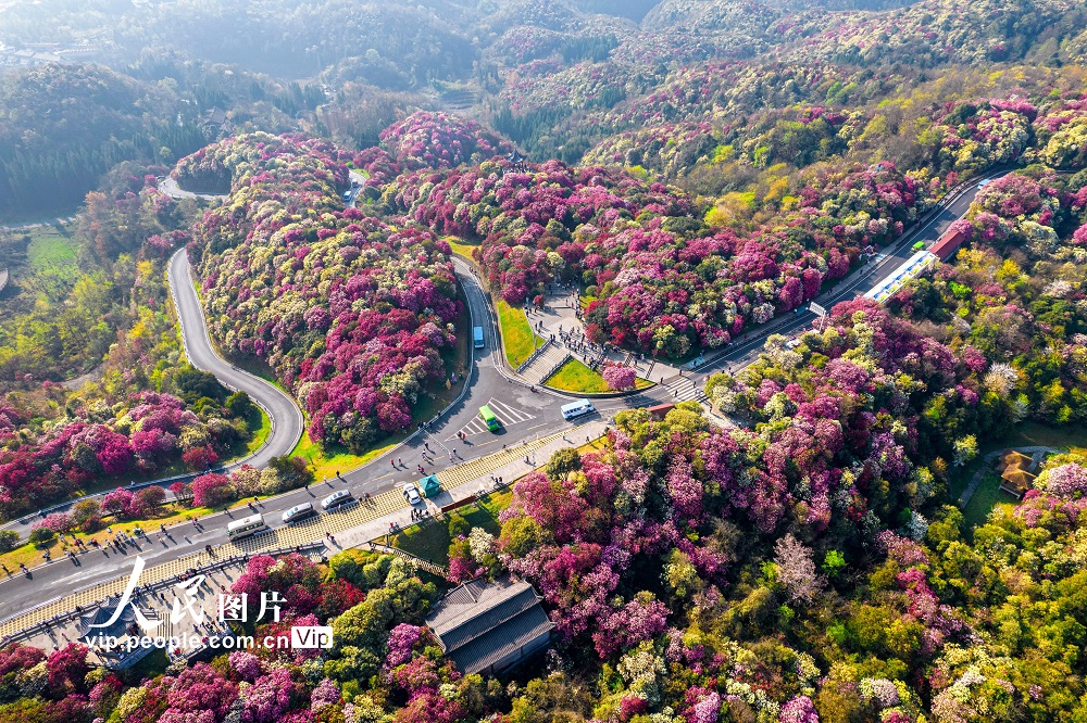 位于乌蒙山腹地的贵州省毕节市百里杜鹃景区,因原生杜鹃林带在乌蒙高原绵延百余里而闻名。目前,景区的各类杜鹃花次第开放,吸引大量游客前来赏花。史开心摄(人民图片网)