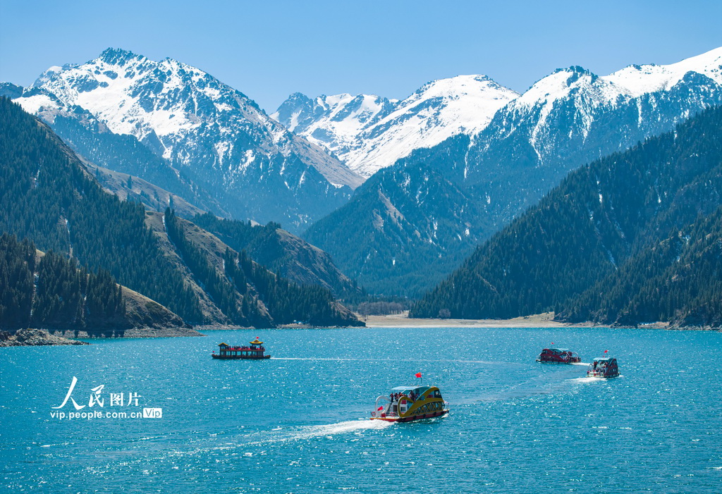 2024年4月30日,新疆维吾尔自治区昌吉回族自治州阜康市天山天池风景区湖面完全解冻,迎来开湖日。山水环翠,湖光山色,吸引不少游客前来游览。何龙摄(人民图片网)