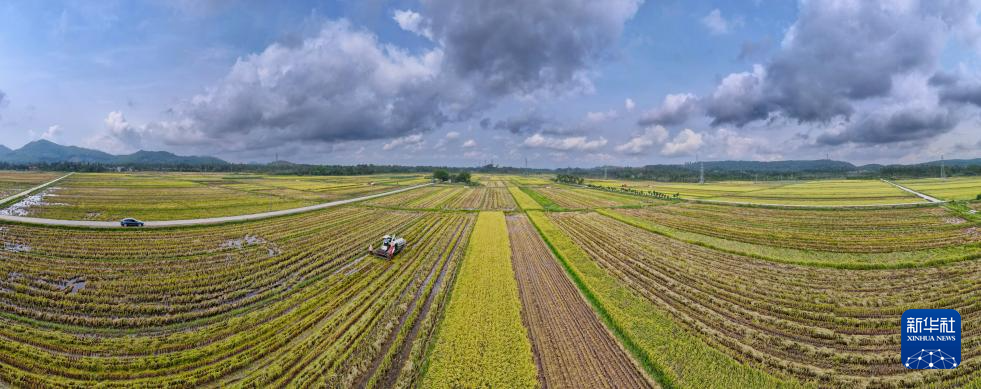 5月4日,海南省琼海市博鳌镇北山村的农民在抢收早稻(无人机全景照片)。