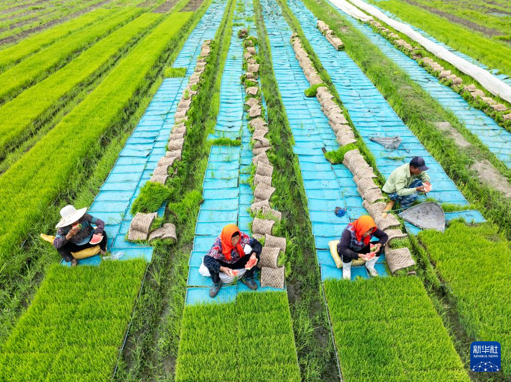 6月19日,在江苏省兴化市林湖乡湾朱村,农民在起秧苗间隙吃西瓜解暑(无人机照片)。
