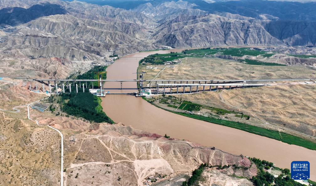6月26日拍摄的沙坡头黄河公路大桥施工现场(无人机照片)。