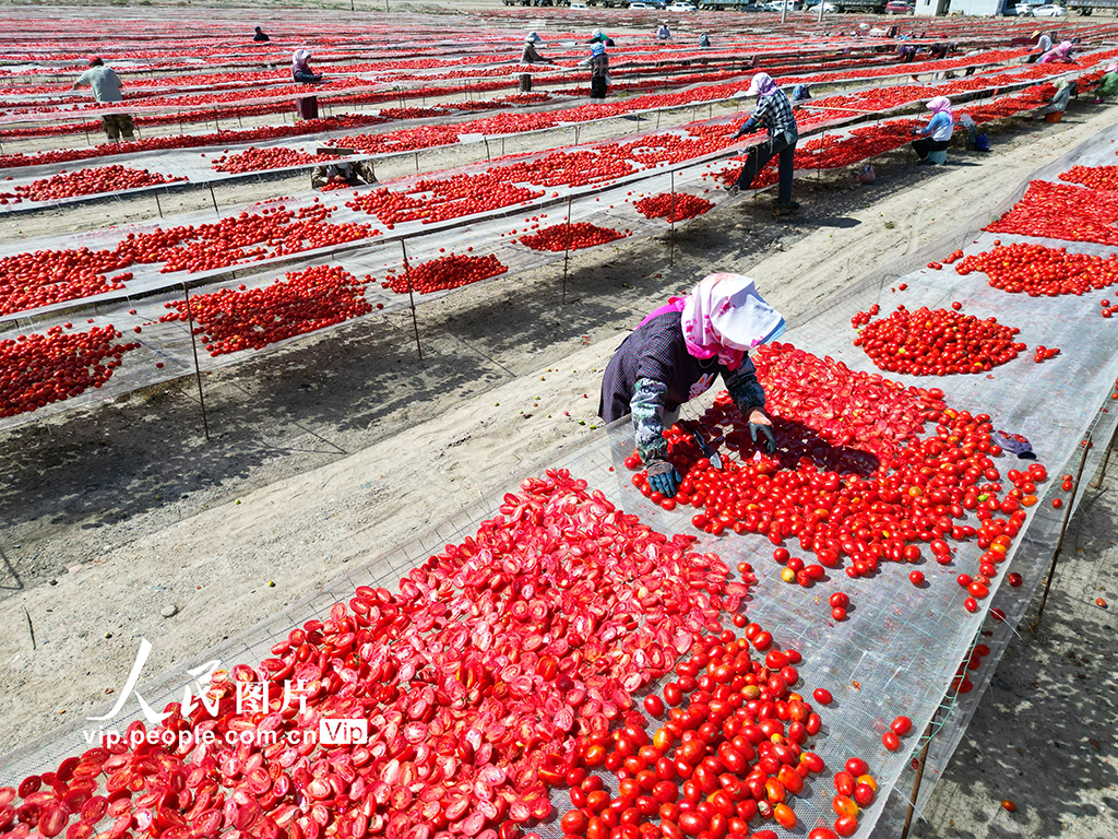 新疆兵团:晾晒番茄干 映红戈壁滩