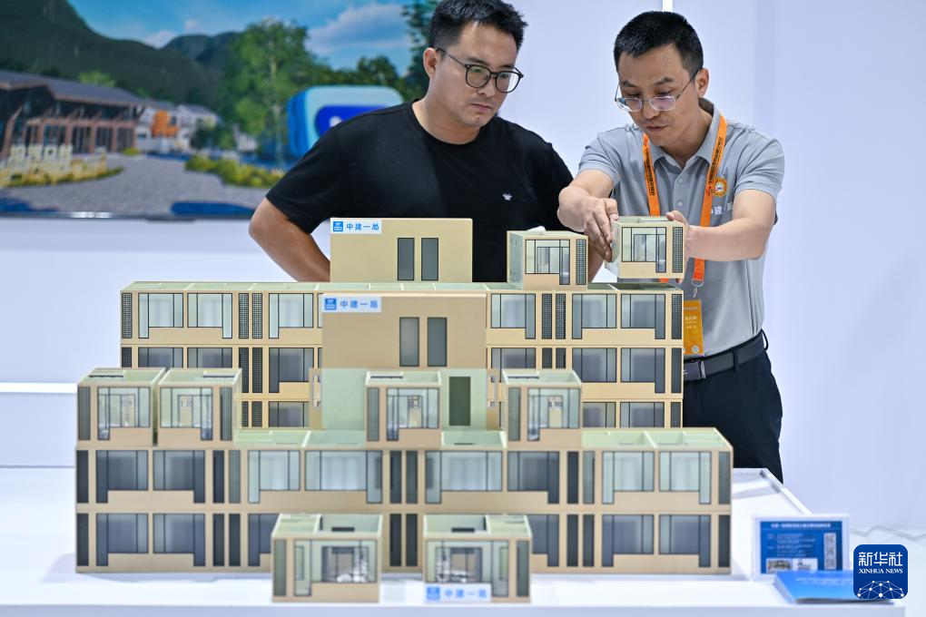 9月13日,参观者在服贸会首钢园区中建一局展台观看预制混凝土结构箱式房屋建筑模型,该建造技术具有模块化设计、工厂化加工、一体化装修等优势,大大缩短施工周期。