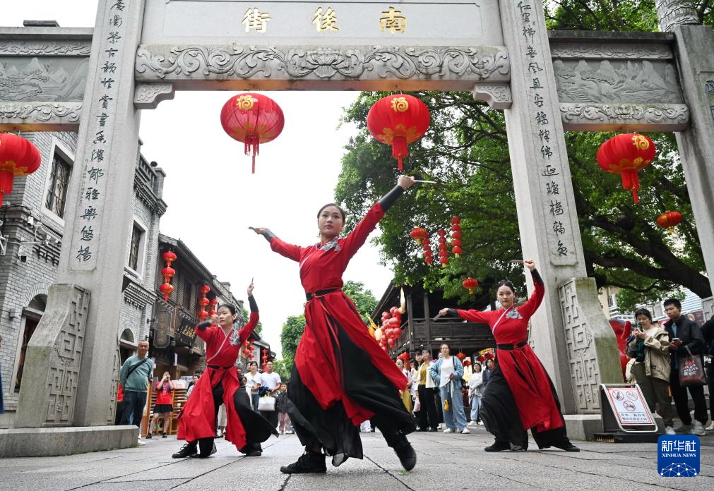 10月4日,青年演员身着中国传统服饰,在福州南后街展示“三条簪”妆束,吸引游客驻足观看。