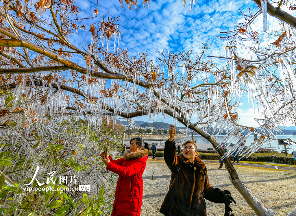 2025年1月16日,受冷空气影响,浙江省杭州市淳安县千岛湖畔出现冰凌景观。杨波摄(人民图片网)