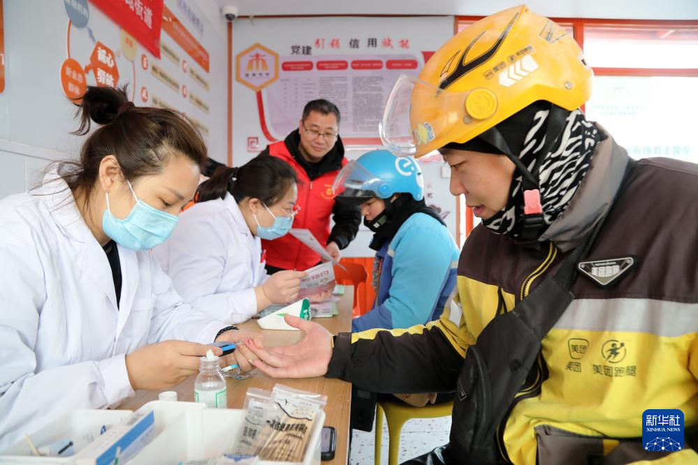 3月5日,志愿者在山东省枣庄市市中区一工会驿站为外卖员免费测量血糖。
