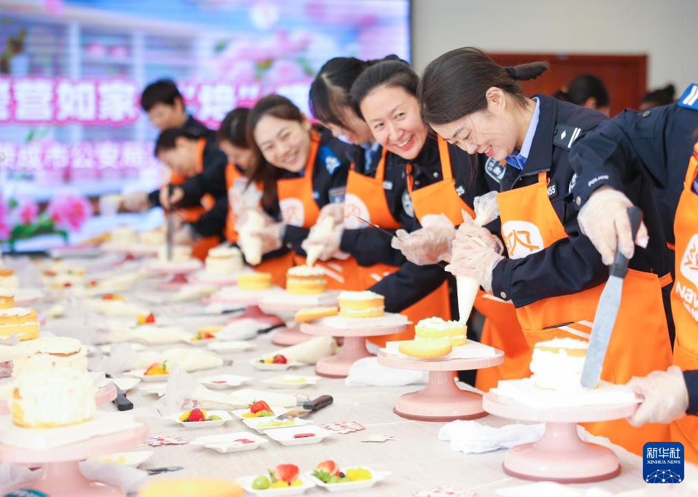 3月6日,在山东省荣成市公安局活动室,女警们在DIY蛋糕制作活动中体验做蛋糕。