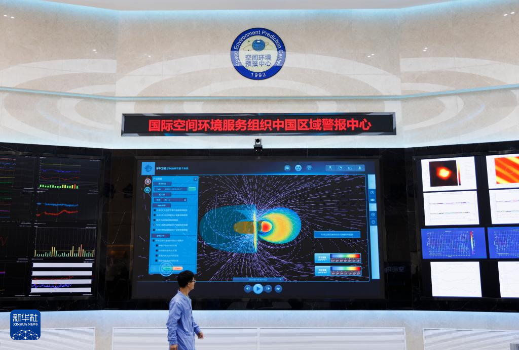 3月20日,在位于北京怀柔的子午工程综合信息与运控中心大楼,一名科研人员走过空间环境预报中心。