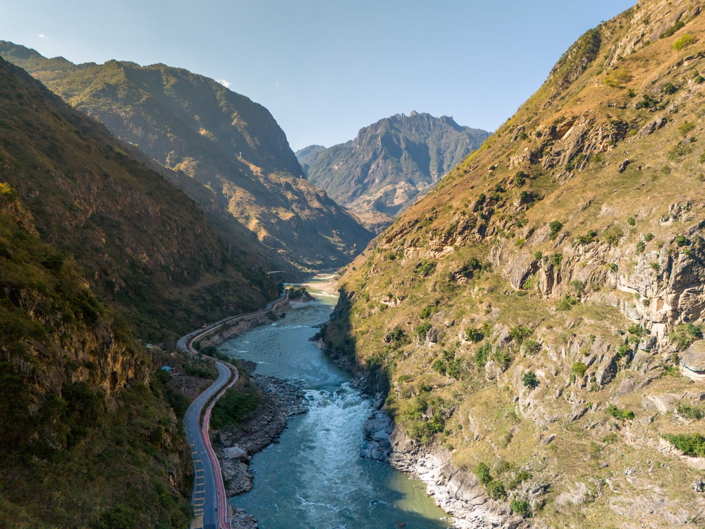 近日的怒江峡谷,碧罗雪山与高黎贡山如巨屏相峙,雪峰残白,两岸绝壁新绿初绽,古朴的村庄点缀其间,构成一幅春日里的美丽画卷。新华社发(彭奕凯 摄)