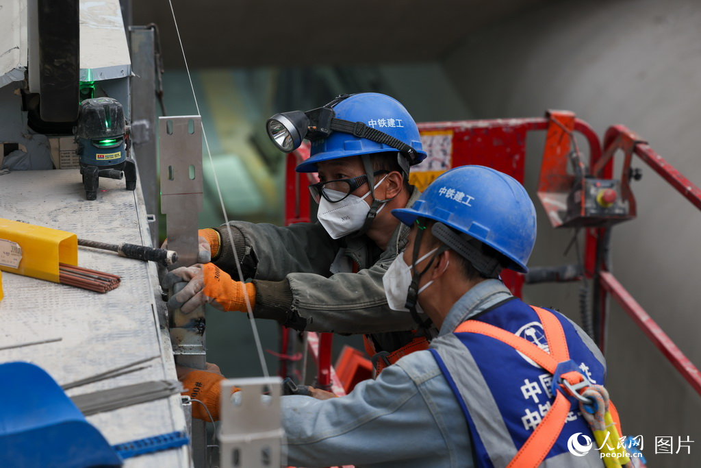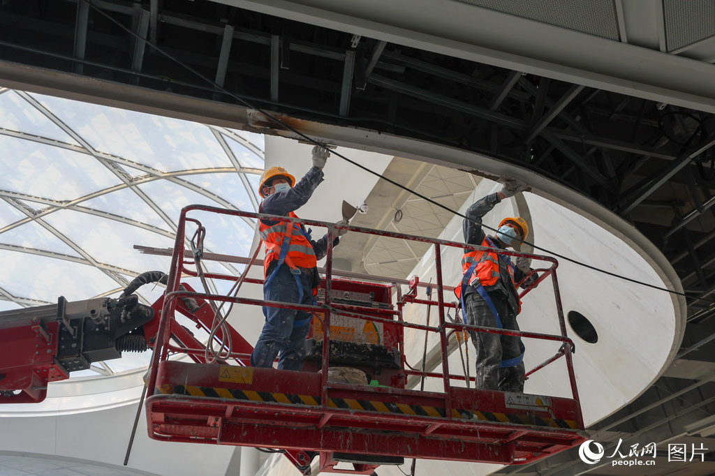 4月29日,工人在北京城市副中心站综合交通枢纽施工02标段加紧施工。据了解,北京城市副中心站综合交通枢纽施工02标段由中铁建工集团承建,目前主体结构已完成验收,正在进行装饰装修施工。人民网记者 张武军摄