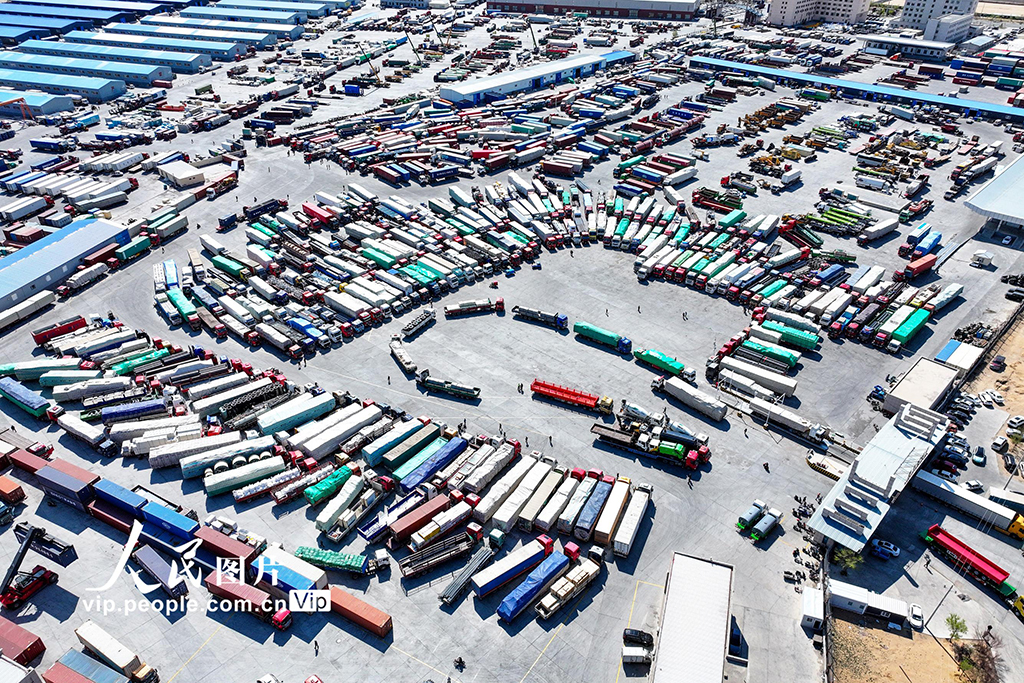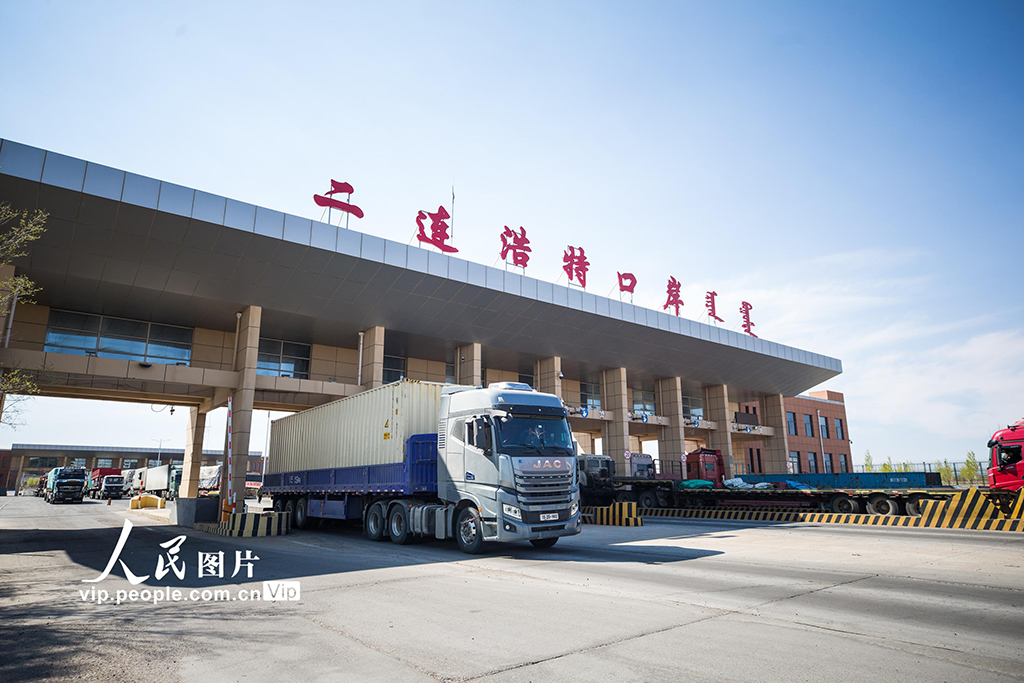 2025年4月30日,内蒙古二连浩特公路口岸货运通道内,一辆辆满载货物的重型货车往来穿梭,繁忙异常,口岸迎来节前车辆集中通关高峰,内蒙古出入境边防检查总站二连出入境边防检查站及时调配执勤警力,开足查验通道,全力保障口岸通关高效顺畅。郭鹏杰摄(人民图片网)