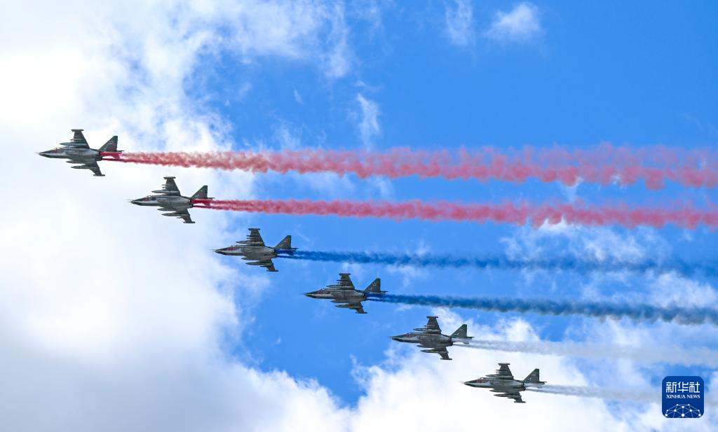 5月9日,在俄罗斯首都莫斯科,参加纪念苏联伟大卫国战争胜利80周年阅兵式的战机编队拉烟飞行。