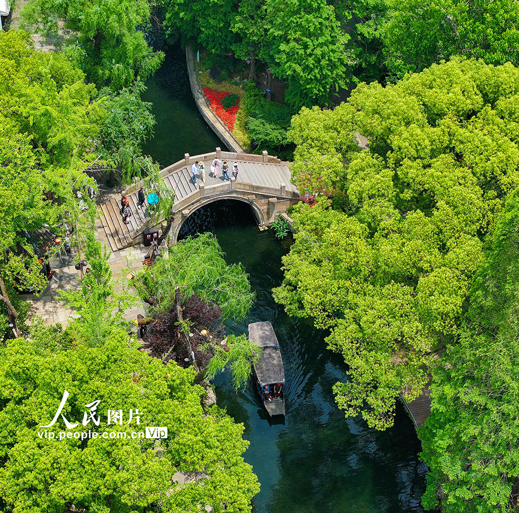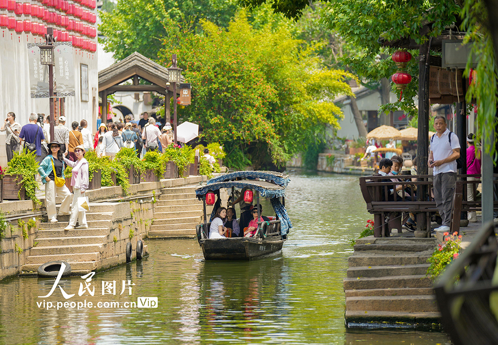 初夏时节,浙江省湖州市南浔区南浔古镇景区内,自然风光美不胜收。游客们漫步于古镇街巷,或驻足游览百年古桥,或泛舟体验传统摇橹船,在移步换景间深度领略江南水乡的独特风情。陈海伟摄(人民图片网)