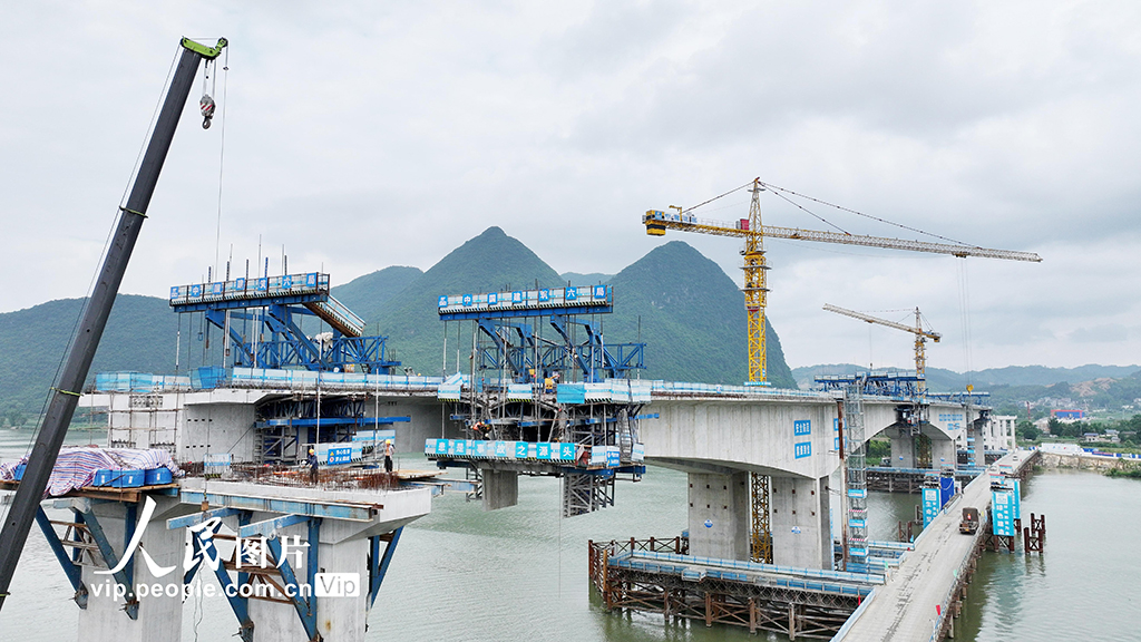 连日来,广西融福(融安县至永福县)高速公路加快施工进度,目前,主桥左幅边跨合龙已完成,计划5月25日中跨合龙;预计7月30日完成全桥合龙,实现双向贯通。谭克兴摄(人民图片网)