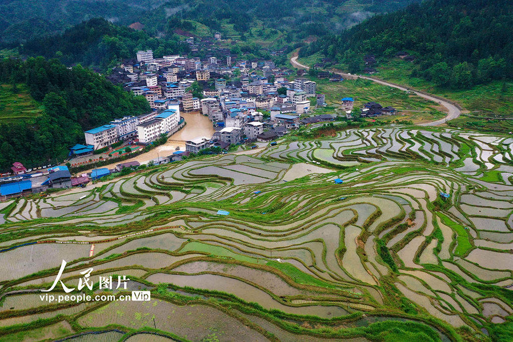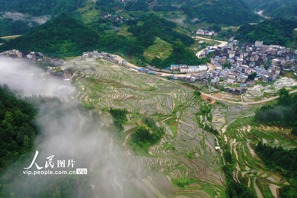 近日,广西融水苗族自治县连片梯田蓄水丰盈,云蒸雾绕,苗寨、河流、青山点缀其间,如诗如画,美不胜收。龙林智摄(人民图片网)