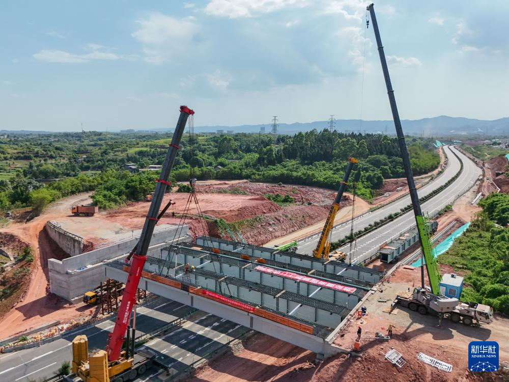 6月10日在四川省成都市金堂县境内拍摄的成南高速扩容工程成阿分离式立交桥钢箱梁架设施工现场(无人机照片)。