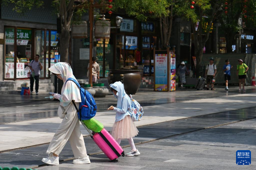 6月23日,在北京前门大街,游客穿着防晒服抵挡烈日。