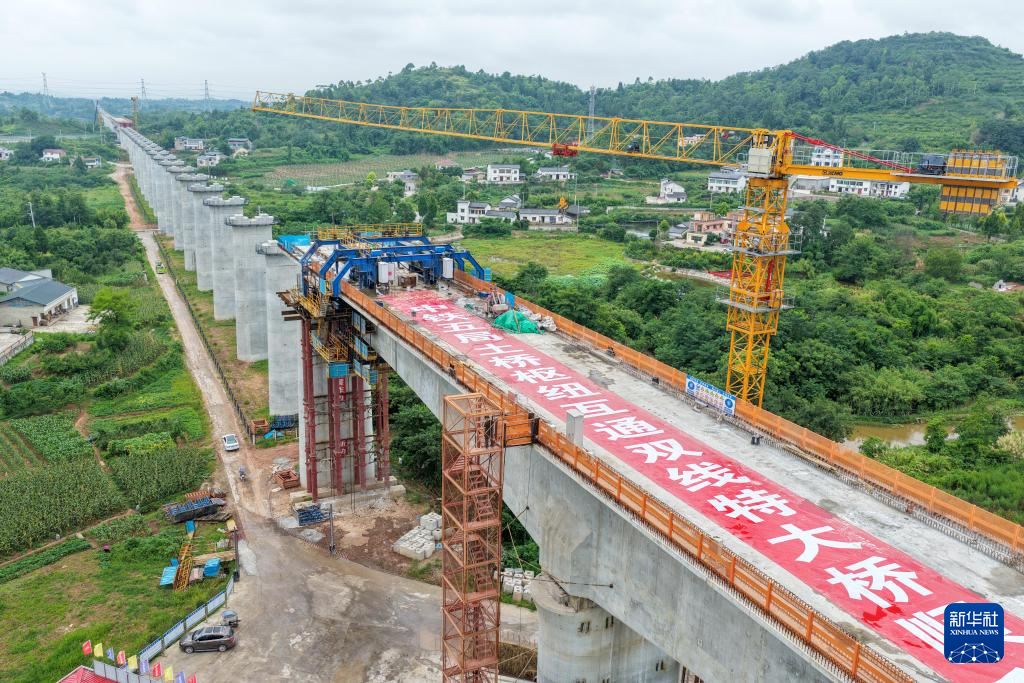 这是7月8日拍摄的成渝中线高铁土桥枢纽互通双线特大桥建设现场(无人机照片)。