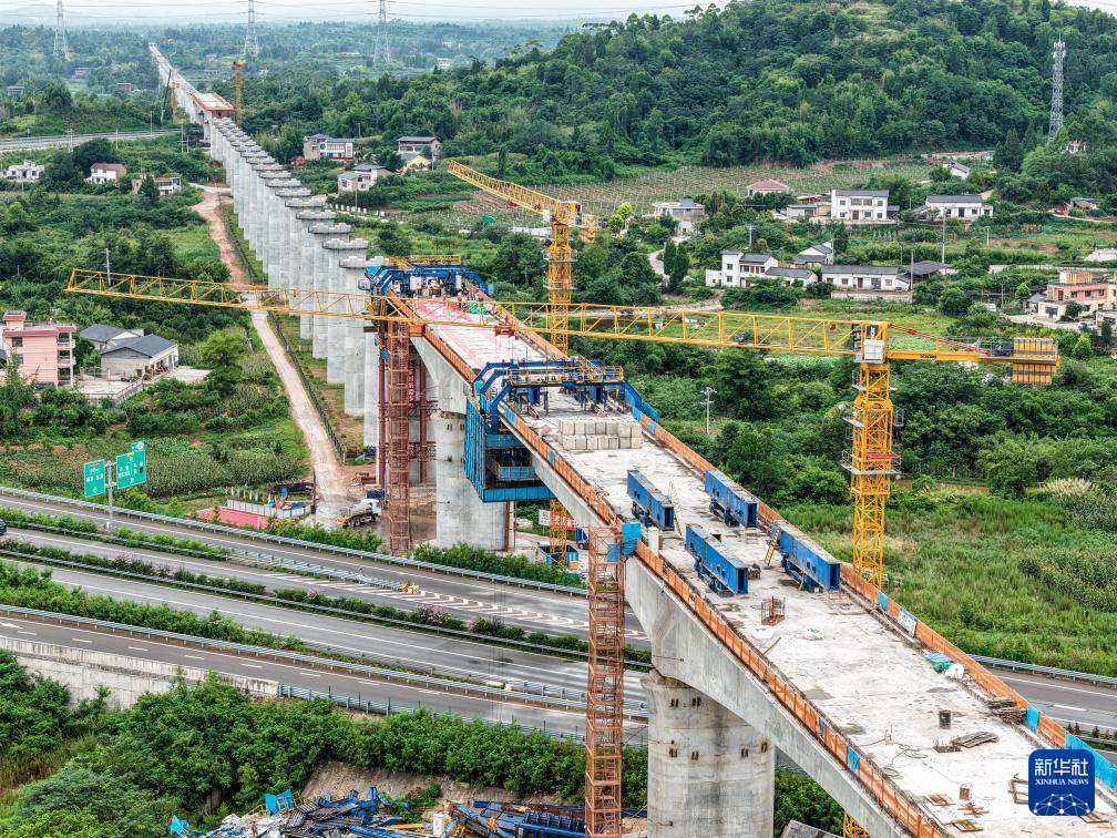 这是7月8日拍摄的成渝中线高铁土桥枢纽互通双线特大桥建设现场(无人机照片)。