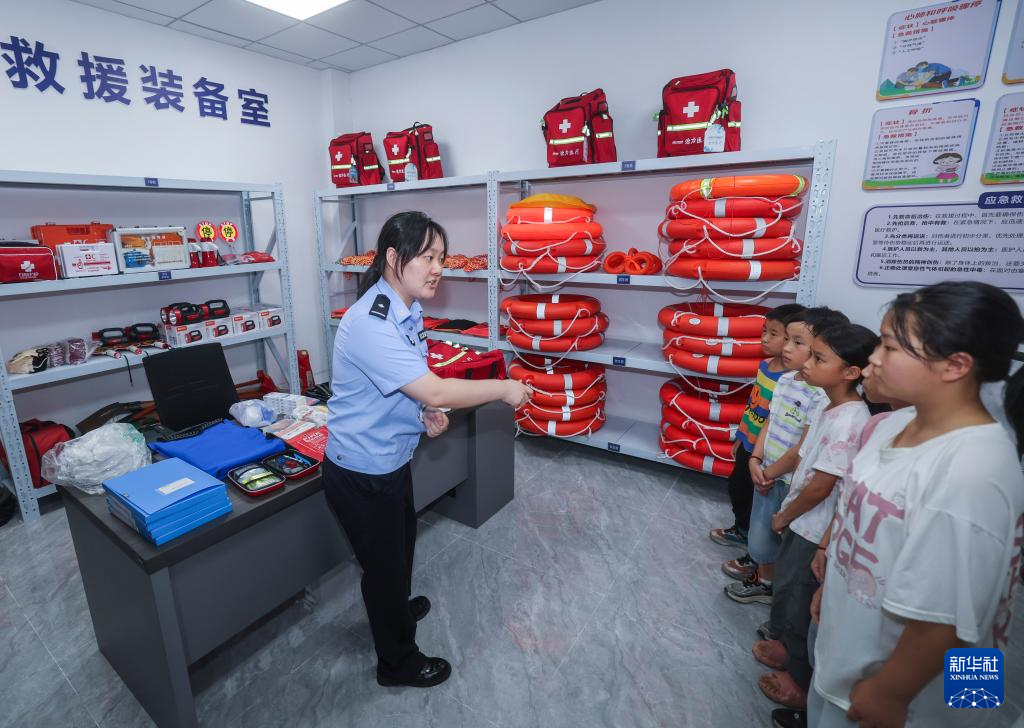 7月15日,在诸暨市安华镇社会治理中心,安华镇派出所民警为孩子们讲解应急救援装备。