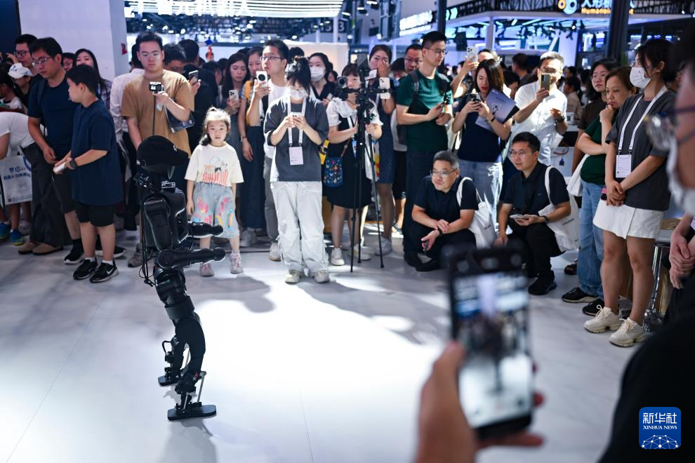 7月29日,观众在傅利叶展区欣赏机器人跳舞。