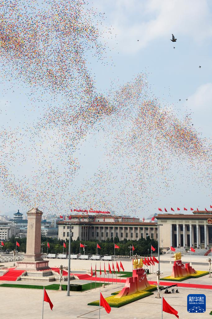 9月3日,纪念中国人民抗日战争暨世界反法西斯战争胜利80周年大会在北京隆重举行。这是纪念大会现场放飞气球。