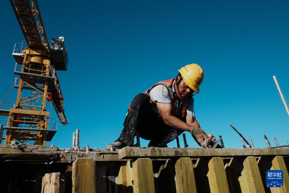 9月6日,中国铁建大桥局建设者在双屿门特大桥东主塔封顶施工现场作业。