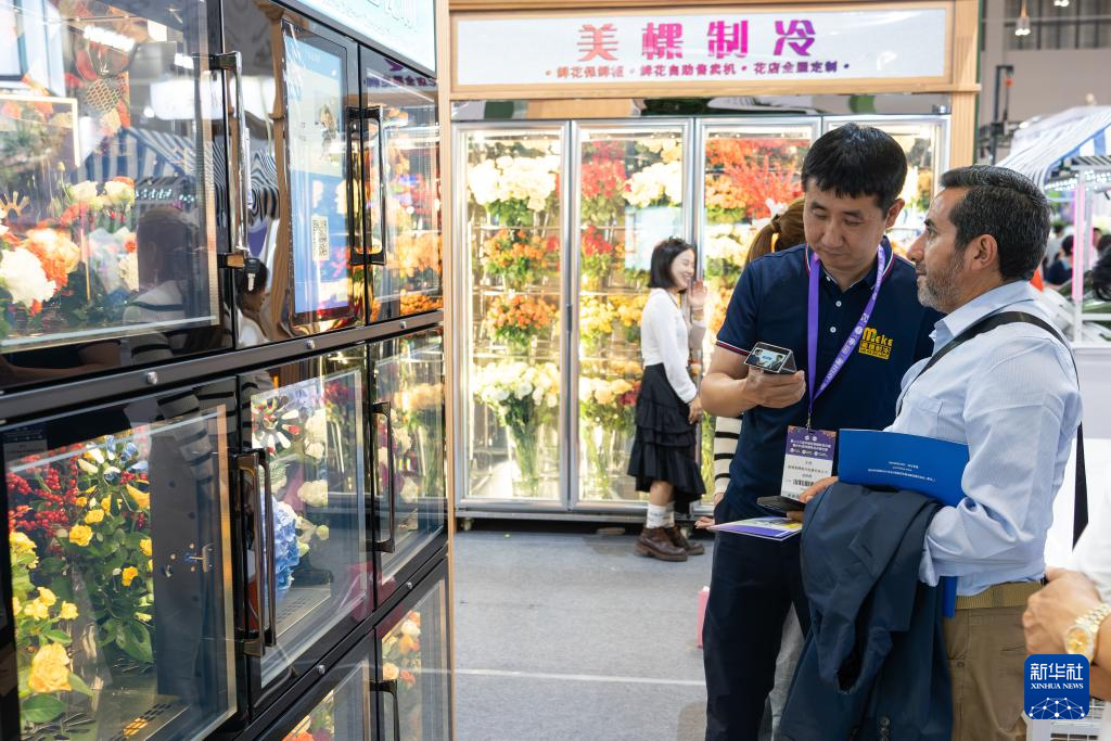 9月19日,观众在第二十三届中国昆明国际花卉展了解一款鲜花自助售卖机。