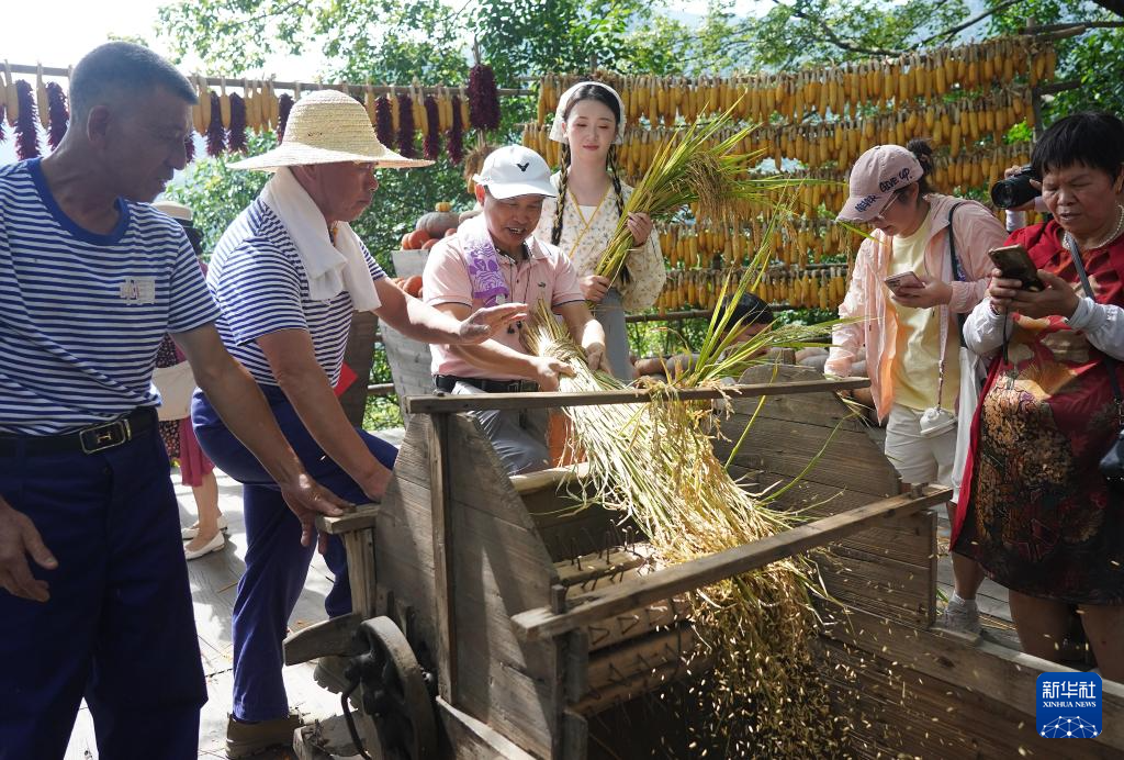 9月23日,游客在江西省婺源县篁岭景区体验传统打谷劳作。