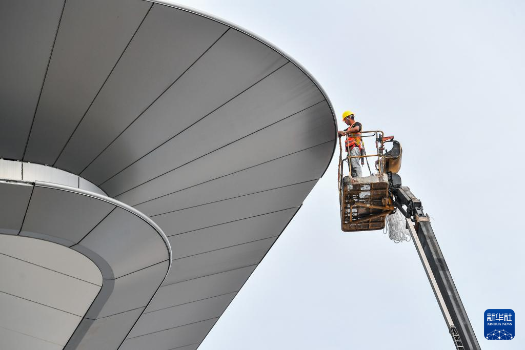 10月2日,在湖南长沙机场改扩建工程T3航站楼施工现场,中建五局不二幕墙公司工人在安装吊顶胶条。