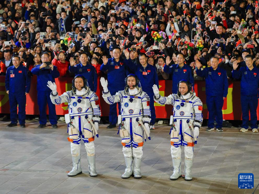 10月31日晚,神舟二十一号载人飞行任务航天员乘组出征仪式在酒泉卫星发射中心问天阁圆梦园广场举行。这是航天员张陆(右)、武飞(中)、张洪章在出征仪式上。