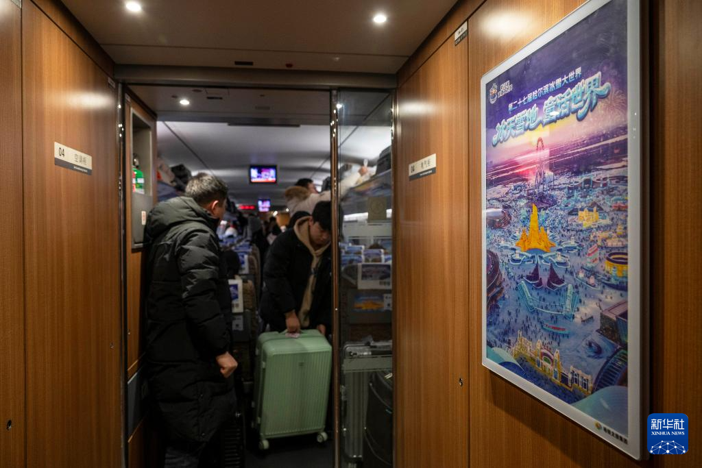 1月4日,旅客在“哈尔滨冰雪大世界”主题高铁列车G1276上整理行李。