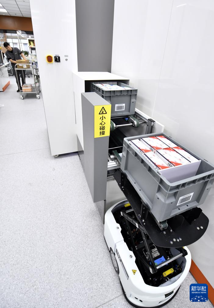 2月3日,北京安贞医院通州院区库发核一体化智慧药房里的机器人将药品运输至全自动发药机。