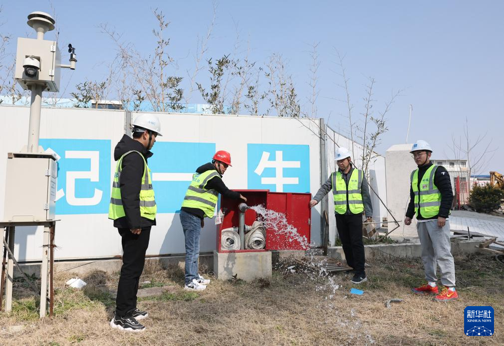 2月18日,工人们在上海复旦大学附属中山医院青浦新城院区一期工程建设项目现场检查消防栓功能。